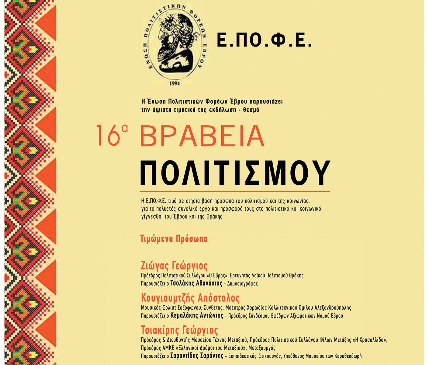 Η Ένωση Πολιτιστικών Φορέων Έβρου σας προσκαλεί να τιμήσετε με την παρουσία σας, τα “16α Βραβεία Πολιτισμού”. Η εκδήλωση θα πραγματοποιηθεί το Σάββατο 6 Δεκεμβρίου, στις 7:00 μ.μ. στο Πνευματικό Κέντρο Ιεράς Μητρόπολης Αλεξανδρούπολης
