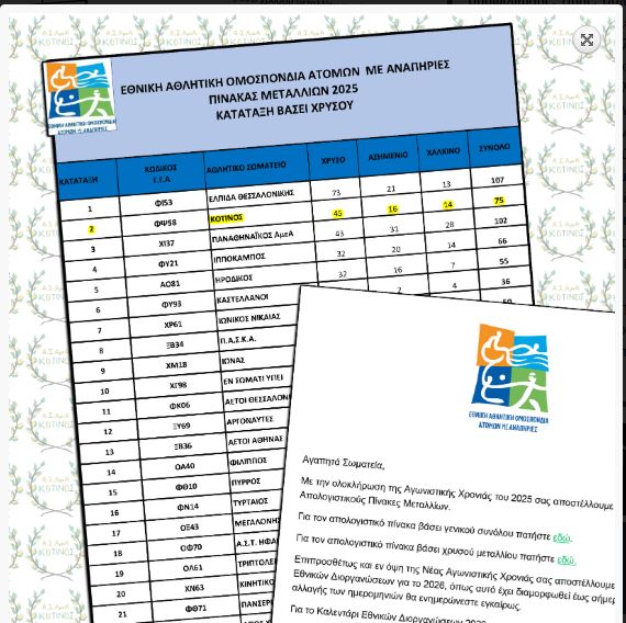 Στην 2η θέση, για μια ακόμη χρονιά, μεταξύ 53 Σωματείων από όλη την Ελλάδα, με τη συλλογή 45 χρυσών μεταλλίων για το 2025, «φιγουράρει» ο Α.Σ. ΑμεΑ «ΚΟΤΙΝΟΣ», σύμφωνα με την επίσημη ανακοίνωση της Εθνικής Αθλητικής Ομοσπονδίας Ατόμων με Αναπηρίες (Ε.Α.ΟΜ. ΑΜΕΑ).
