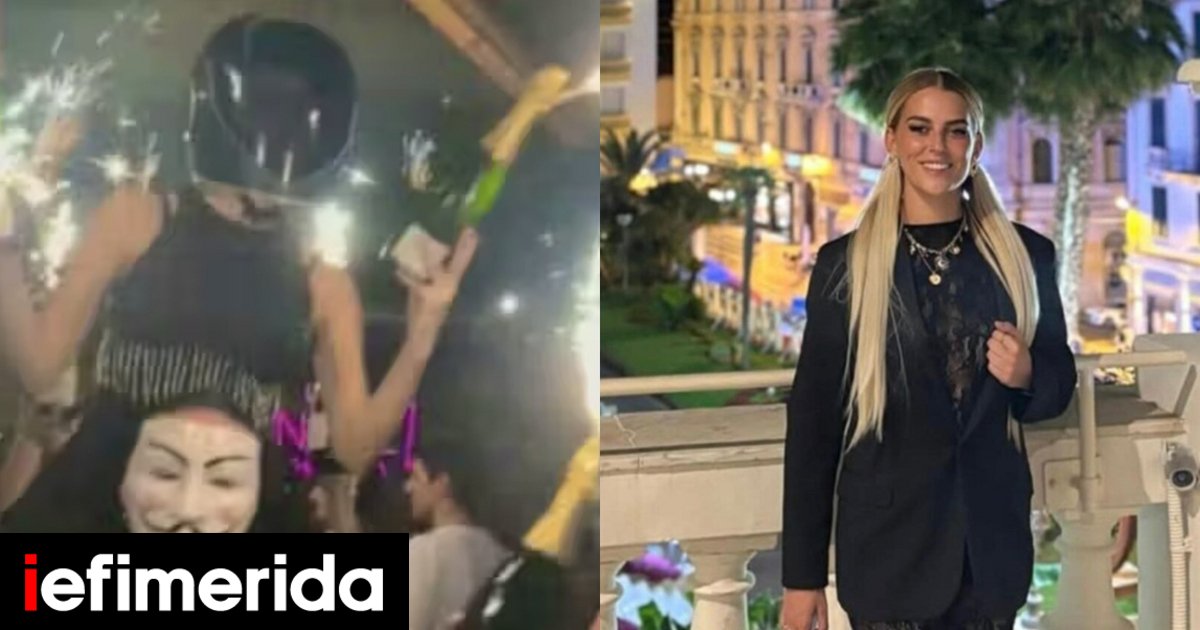 Φωτογραφίες και βίντεο δείχνουν τη νεαρή γυναίκα να κάθεται στους ώμους συναδέλφου της, κρατώντας δύο μπουκάλια σαμπάνιας με βεγγαλικά επάνω τους, λίγο πριν η οροφή του χώρου τυλιχθεί στις φλόγες.