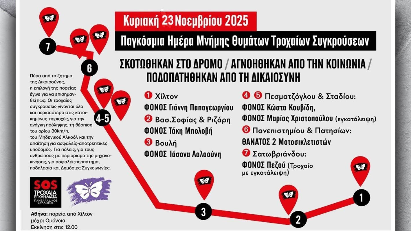 Αυτή την Κυριακή 23/11, θα πραγματοποιηθεί η πορεία μνήμης στο κέντρο της Αθήνας για την Παγκόσμια Ημέρα Μνήμης Θυμάτων Τροχαίων Συγκρούσεων (16/11) που διοργανώνει ο Πανελλήνιος Σύλλογος SOS Τροχαία Εγκλήματα. Η πορεία γίνεται μια εβδομάδα μετά εξαιτίας της απαγόρευσης συγκεντρώσεων που εξέδωσε η ΕΛΑΣ, λόγω της επίσκεψης του προέδρου της Ουκρανίας, Βολοντίμιρ Ζελένσκι. Με μεγάλη επιτυχία διεξήχθησαν οι συγκεντρώσεις σε Θεσσαλονίκη και Ηράκλειο την προηγούμενη Κυριακή 16/11. Οι συγγενείς των θυμάτων που έχασαν τους ανθρώπους τους στον δρόμο καλούν κάθε πολίτη και φορέα σε αυτή τη διαδρομή της Κυριακής.