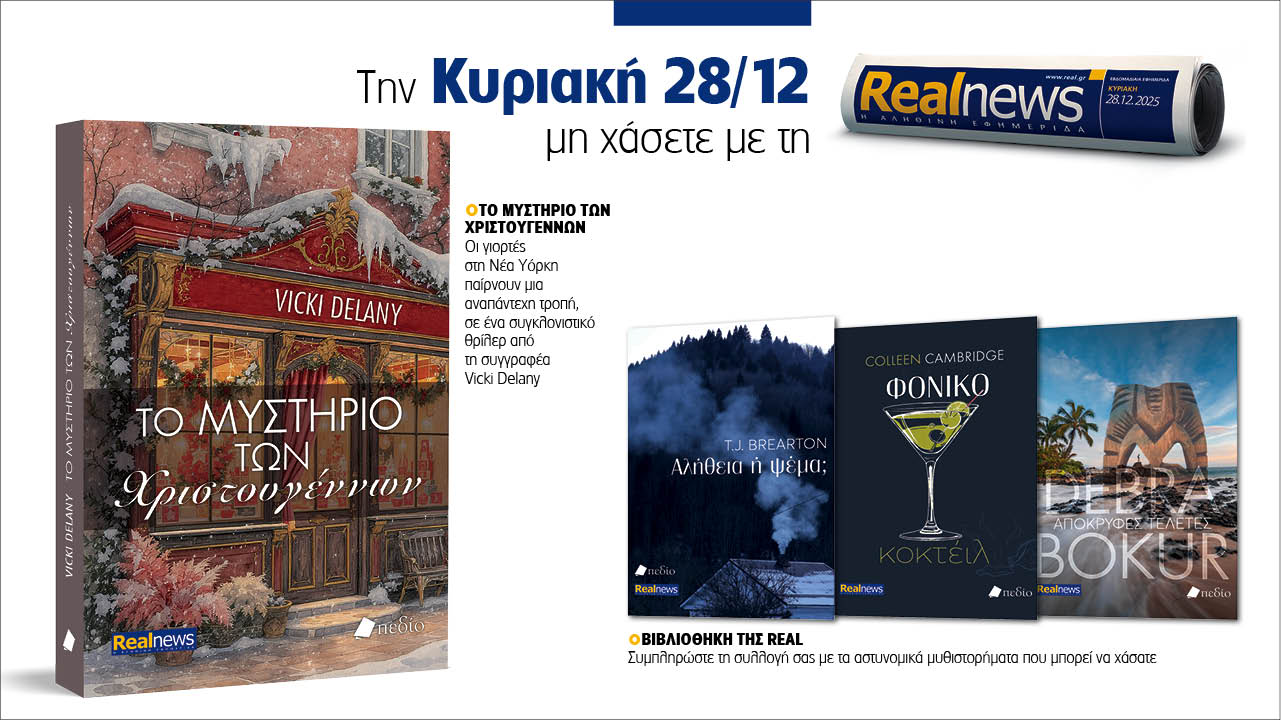 Αυτή την Κυριακή με τη Realnews: Το μυστήριο των Χριστουγέννων της Vicki Delany – Μαζί αστυνομικά μυθιστορήματα Enikos Newsroom 07:02, Δευτέρα 22 Δεκεμβρίου 2025 Media Αυτή την Κυριακή με τη Realnews: Το μυστήριο των Χριστουγέννων της Vicki Delany – Μαζί αστυνομικά μυθιστορήματα