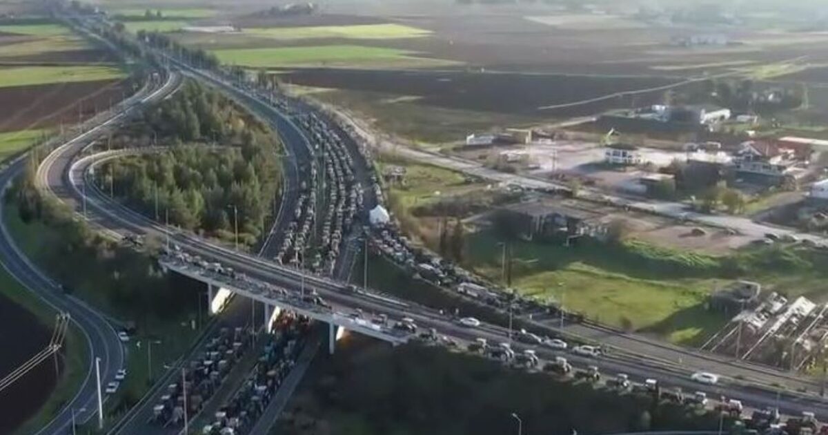 Οι εικόνες από το drone στο Mega είναι χαρακτηριστικές. Αμέτρητα είναι τα τρακτέρ που έχουν παραταχθεί στην εθνική οδό στον κόμβο της Νίκαιας.