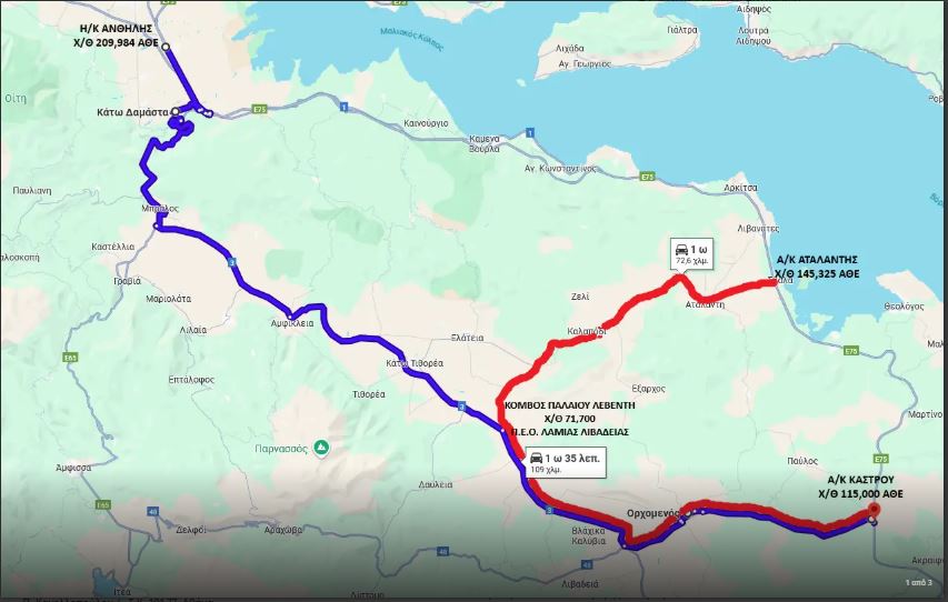 έξοδος από τον Αυτοκινητόδρομο στον Η/Κ Ανθήλης και κινούμενοι μέσω Μπράλου, Αμφίκλειας, Κάτω Τιθορέας, Ορχομενού να εισέρχονται στον Α/Κ Κάστρου (επισυνάπτεται σχετική οπτική απεικόνιση)