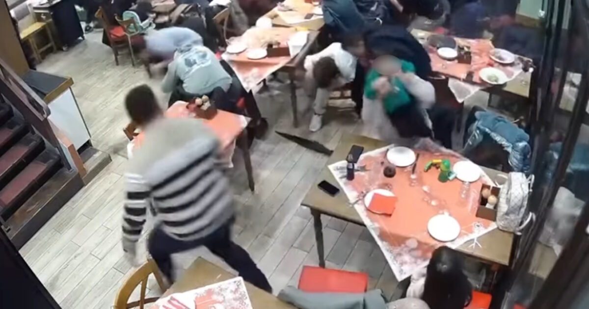 Στις εικόνες, φαίνεται μάλιστα να σπάει ένα παράθυρο, τη στιγμή που όλοι οι πελάτες τρέχουν να καλυφθούν προς την κουζίνα του καταστήματος.