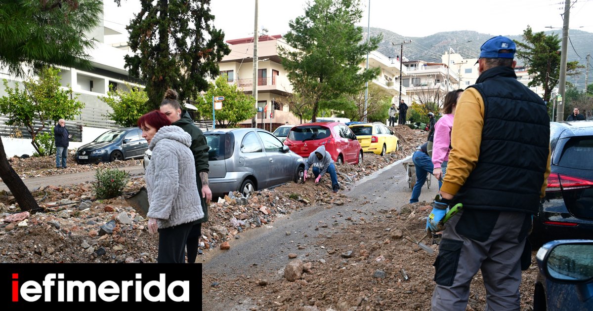 Με φτυάρια, με πρόχειρα εργαλεία, ακόμα και με κουτάλια στα χέρια, οι κάτοικοι στην οδό Μετσόβου στην Άνω Γλυφάδα προσπαθούν από το πρωί της Πέμπτης (22/1) να ξεθάψουν τις περιουσίες τους από τη λάσπη.