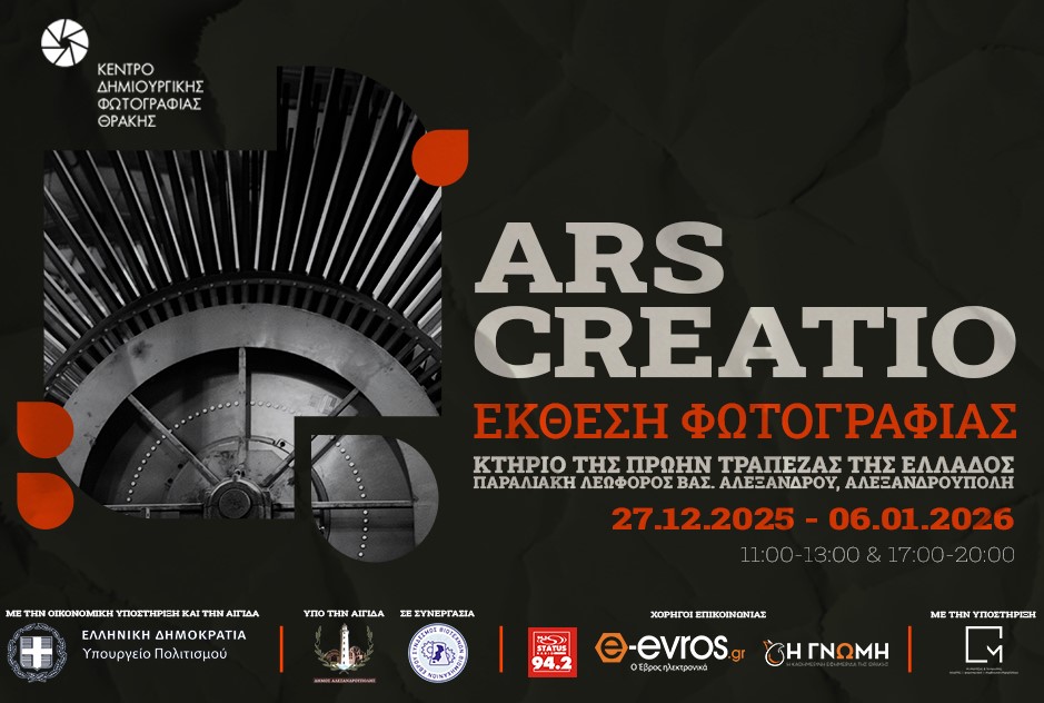 Η έκθεση φωτογραφίας “ARS CREATIO” πραγματοποιείται με την οικονομική υποστήριξη και την αιγίδα του Υπουργείου Πολιτισμού, την αιγίδα του Δήμου Αλεξανδρούπολης και σε συνεργασία του Συνδέσμου Βιοτεχνιών – Βιομηχανιών Έβρου, που στηρίζει την προσπάθεια φέρνοντας στο προσκήνιο έναν κόσμο που, αν και αθόρυβος, αποτελεί θεμέλιο της τοπικής ζωής. Χορηγός Επικοινωνίας “Η ΓΝΩΜΗ”