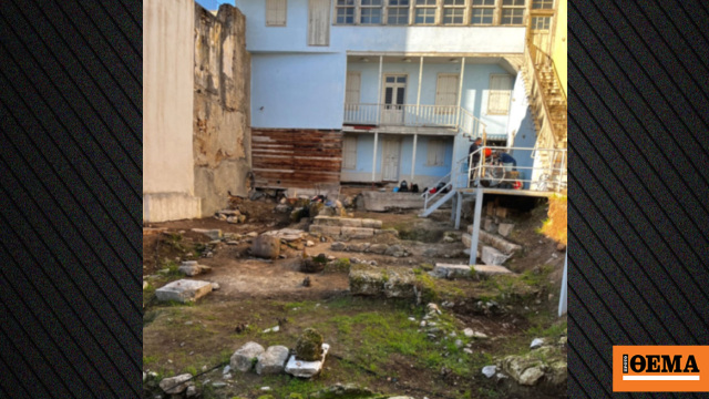 Το ανάλημμα της αρχαίας οδού Τριπόδων στον αύλειο χώρο. Διακρίνονται υστερορωμαϊκοί-παλαιοχριστιανικοί αγωγοί