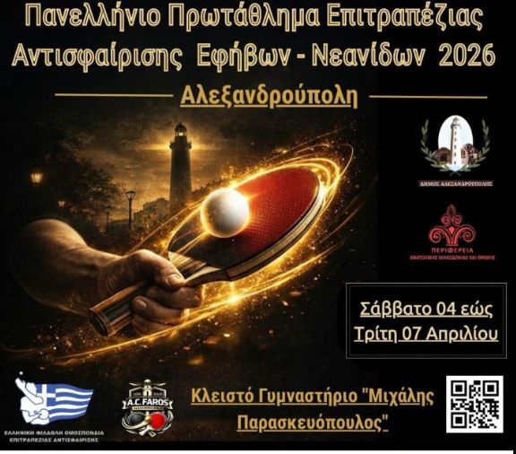 Η Αλεξανδρούπολη θ’ αναδείξει φέτος τους καλύτερους της ηλικιακής κατηγορίας κάτω των 19 στην επιτραπέζια αντισφαίριση. Με το πρώτο της στα χρονικά Πανελλήνιο πρωτάθλημα, το οποίο αφορά στους εφήβους και τις νεάνιδες και το πραγματοποιεί στο κλειστό γυμναστήριο Μιχάλης Παρασκευόπουλος από αύριο Σάββατο 4 μέχρι τη Μ. Τρίτη 7 Απριλίου.