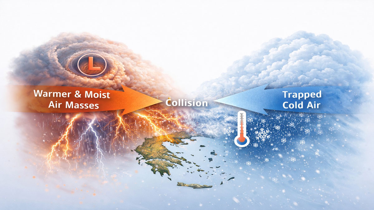 Θα υπάρχει ψυχρή, ξηρότερη αέρια μάζα κοντά στο έδαφος και στα χαμηλά στρώματα (κρύο υπόστρωμα), και από πάνω της θα αρχίσουν να εισβάλλουν θερμότερες και πολύ υγρές αέριες μάζες που συνοδεύουν το χαμηλό (υγρή τροφοδοσία).