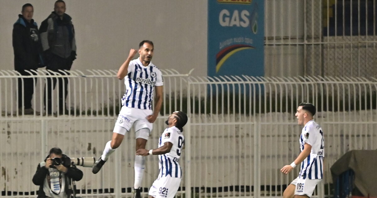 Ο Σταυρόπουλος πανηγυρίζει τοπ γκολ του/ (ΜΙΧΑΛΗΣ ΚΑΡΑΓΙΑΝΝΗΣ / EUROKINISSI)