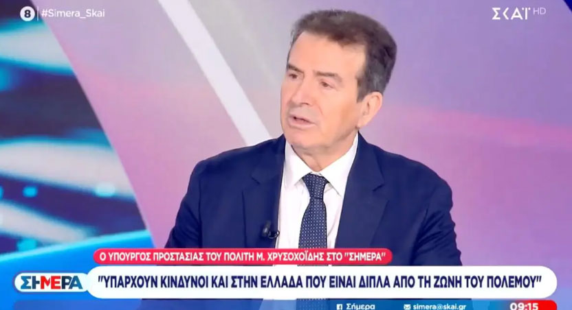 «Mια χώρα σαν την Ελλάδα που γειτνιάζει με τη φωτιά, πρέπει να λαμβάνει όλα τα αναγκαία μέτρα που ενδεχομένως μπορεί να την πλήξουν. Εμείς, χωρίς να πανικοβαλλόμαστε και χωρίς να πανικοβάλουμε τον κόσμο, οφείλουμε να διασφαλίσουμε στους Έλληνες πολίτες την ασφάλειά τους», τόνισε ο υπουργός Προστασίας του Πολίτη, Μιχάλης Χρυσοχοΐδης σε συνέντευξή του στον ΣΚΑΪ, στην εκπομπή «Σήμερα».