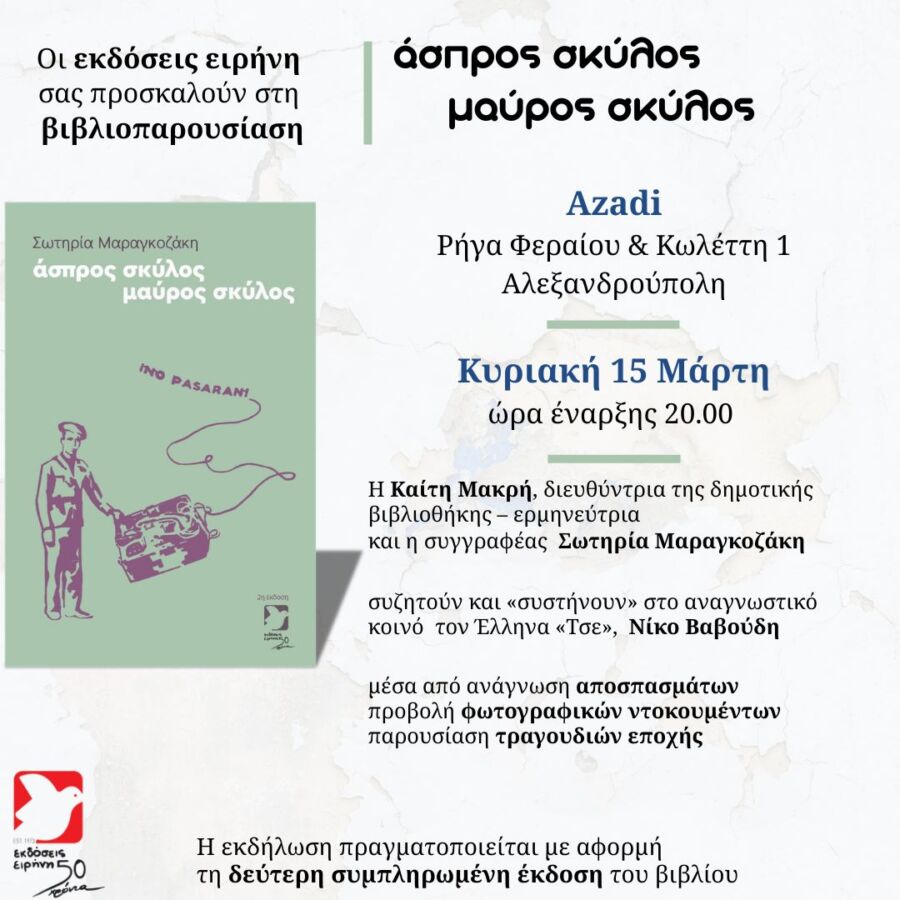 «Ευχαριστώ από καρδιάς όλους εσάς για την εμπιστοσύνη και την υποστήριξη καθώς και τον εκδότη μου Κωνσταντίνο Κατσικέα και τις Eκδόσεις ειρήνη – Irini Publications. Στην Αλεξανδρούπολη παρουσιάζεται για πρώτη φορά η 2η βελτιωμένη έκδοση του βιβλίου στο καφε μπαρ/ βιβλιοπωλείο AZADI» αναφέρει η Σ. Μαραγκοζάκη.