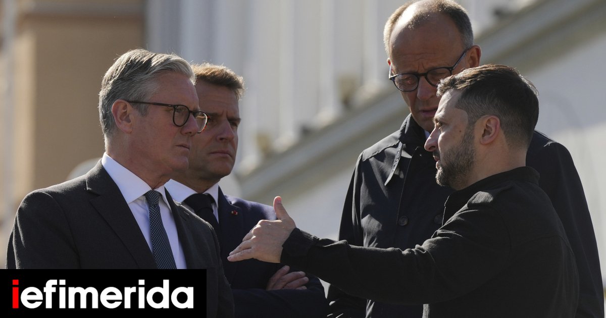 Οι ηγέτες της Βρετανίας, της Γαλλίας και της Γερμανίας, Στάρμερ, Μακρόν και Μερτς, με τον Ουκρανό πρόεδρο Βολοντίμιρ Ζελένσκι / AP