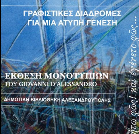 Η Δημοτική Βιβλιοθήκη Αλεξανδρούπολης φιλοξενεί την Έκθεση Μονοτυπιών του Giovanni D’Alessandro με τίτλο «Γραφιστικές Διαδρομές για μια Άτυπη Γένεση» η οποία διοργανώνεται με πρωτοβουλία του Πολιτιστικού Σωματείου AIAL Λέρου, με την υποστήριξη της Ακαδημίας Καλών Τεχνών του Παλέρμο και με τη στήριξη της FSC Group Αθηνών και του Château Nico Lazaridi και τελεί υπό την αιγίδα του Ιταλικού Μορφωτικού Ινστιτούτου Αθηνών, της Περιφέρειας Σικελίας και του Δήμου Παλέρμο.