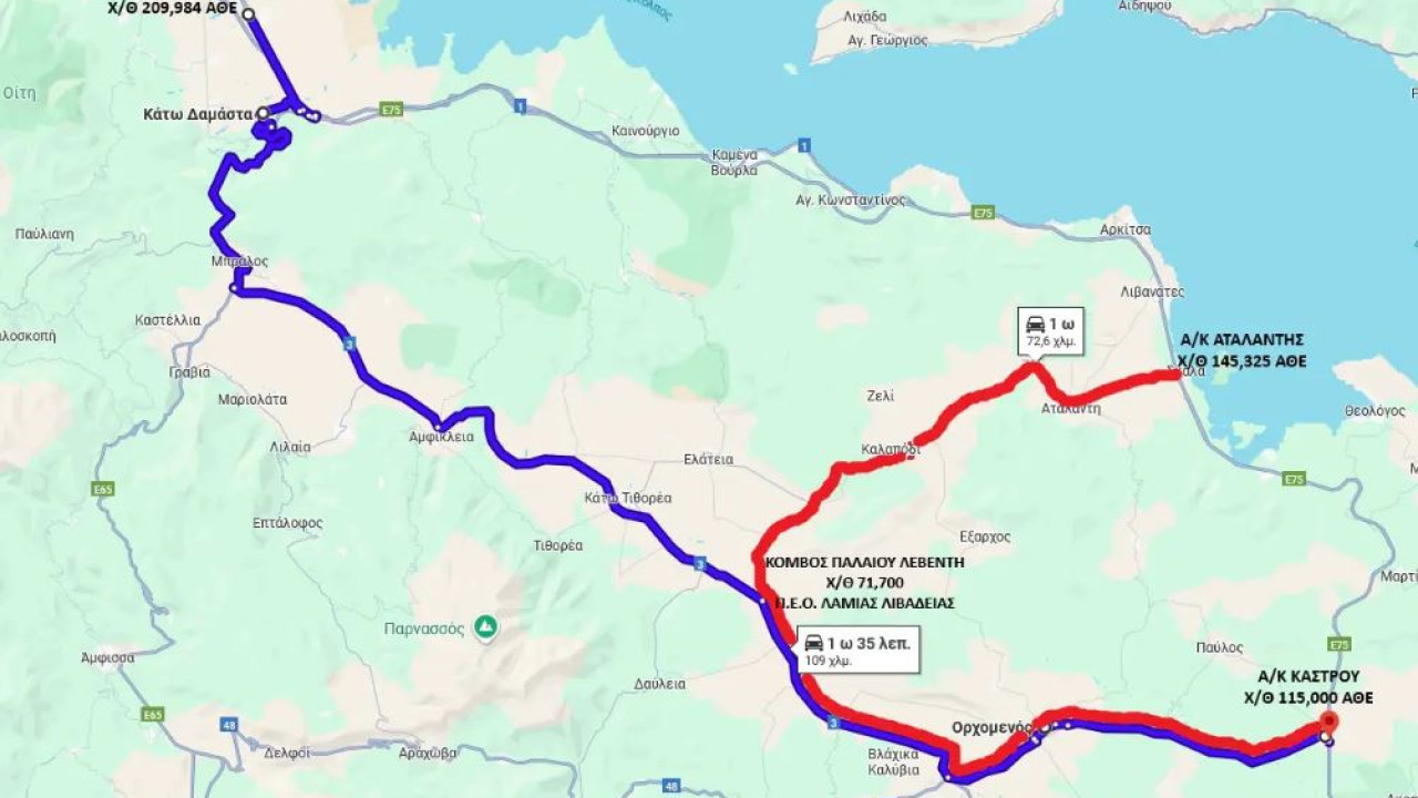 1) έξοδος από τον Αυτοκινητόδρομο στον Η/Κ Ανθήλης και κινούμενοι μέσω Μπράλου, Αμφίκλειας, Κάτω Τιθορέας, Ορχομενού να εισέρχονται στον Α/Κ Κάστρου (επισυνάπτεται σχετική οπτική απεικόνιση)