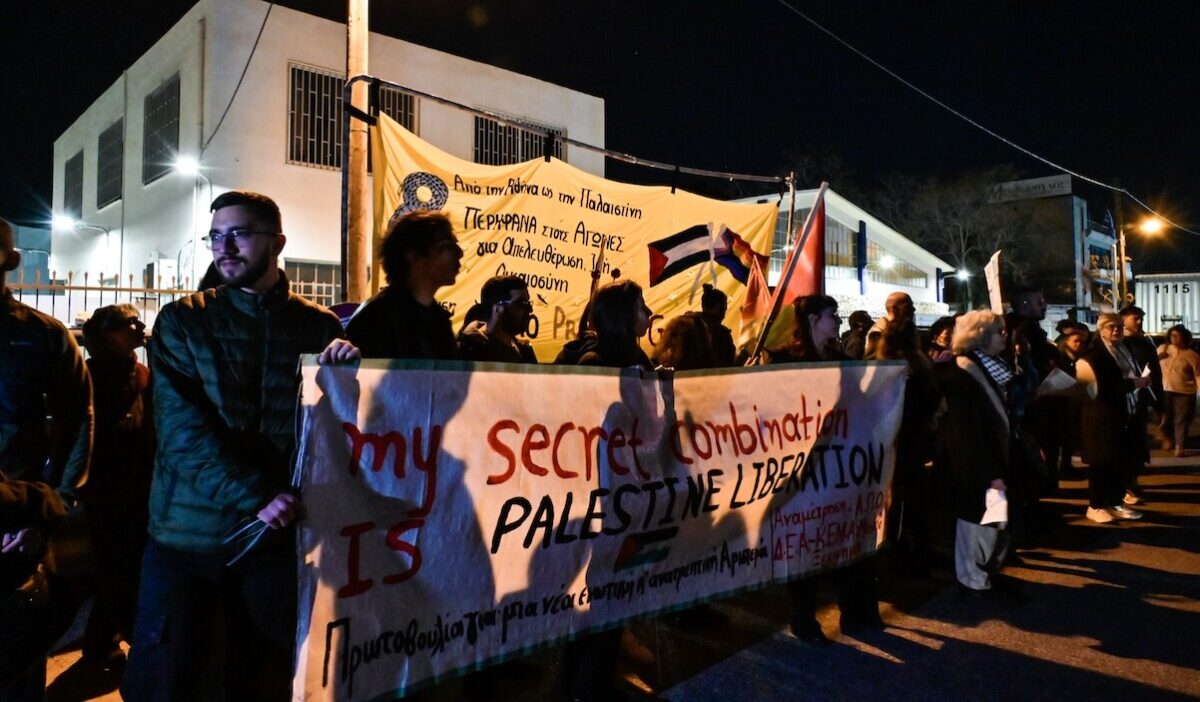 Συγκέντρωση διαμαρτυρίας πραγματοποιήθηκε έξω από τον Πολυχώρο του Φεστιβάλ Αθηνών το βράδυ της Κυριακής (15/2), την ώρα που στο εσωτερικό διεξαγόταν ο τελικός για την επιλογή του τραγουδιού που θα εκπροσωπήσει την Ελλάδα στη φετινή Eurovision. Ads Οι συγκεντρωμένοι, κρατώντας πανό και φωνάζοντας συνθήματα υπέρ της Παλαιστίνης, ζήτησαν να αποκλειστεί το Ισραήλ από τον διαγωνισμό.