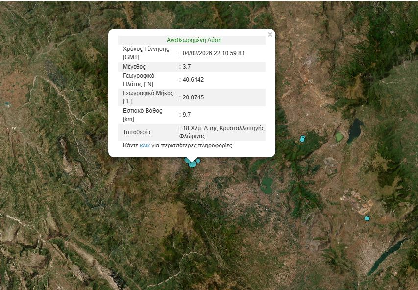 Συγκεκριμένα λίγο μετά τα μεσάνυχτα της Πέμπτης 5 Φεβρουαρίου και ώρα 00:10, σημειώθηκε νέος σεισμός μεγέθους 3,7 βαθμών της κλίμακας Ρίχτερ, με επίκεντρο 18 χλμ Δυτικά της Κρυσταλλοπηγής Φλώρινας και σε εστιακό βάθος 9.7 χλμ. Πολύ κοντά στο ίδιο σημείο, 23 χλμ Δυτικά της Κρυσταλλοπηγής, είχε καταγραφεί νωρίτερα, στις 19:50, σεισμός ίδιου μεγέθους σε εστιακό βάθος 10 χλμ.