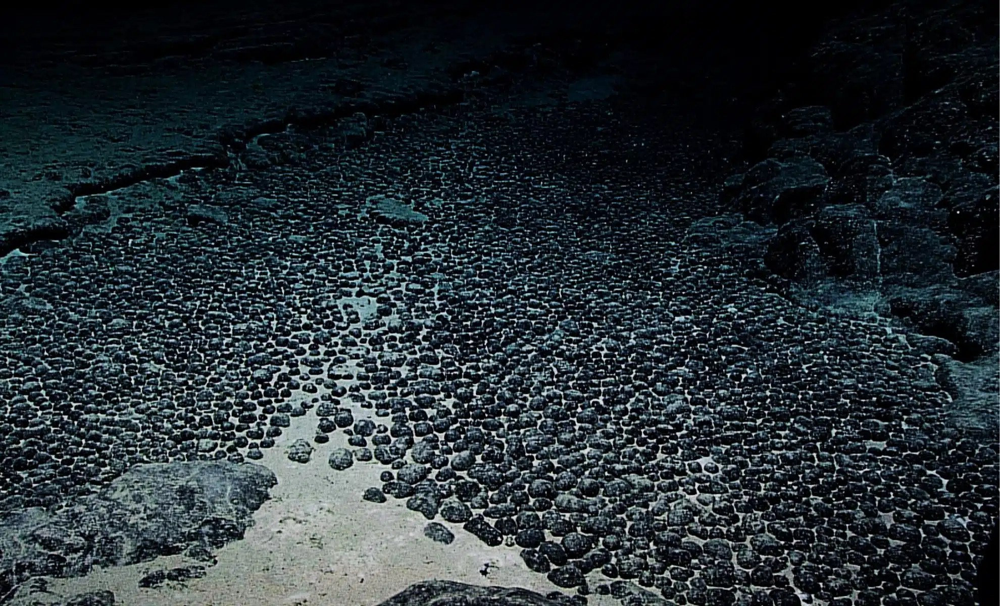 Υποβρύχια πλάνα από οζίδια μαγγανίου στον πυθμένα της θάλασσας, ληφθέντα από τηλεκατευθυνόμενο όχημα (ROV). Πηγή: USGS