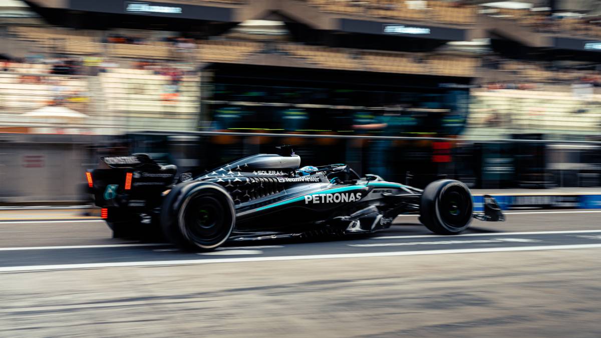 Ο Τζορτζ Ράσελ σημείωσε τον πρώτο χρόνο στην τελευταία περίοδο ελεύθερων δοκιμών του 2025. Νόρις και Φερστάπεν πίσω του, στον τοίχο ο Χάμιλτον.