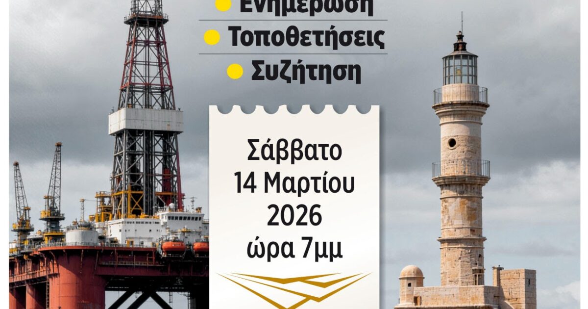 Η Πρωτοβουλία Κρήτης διοργανώνει εκδήλωση ενάντια στις εξορύξεις υδρογονανθράκων στο Πνευματικό Κέντρο στα Χανιά το Σάββατο 14 Μαρτίου στις 19:00 το απόγευμα.