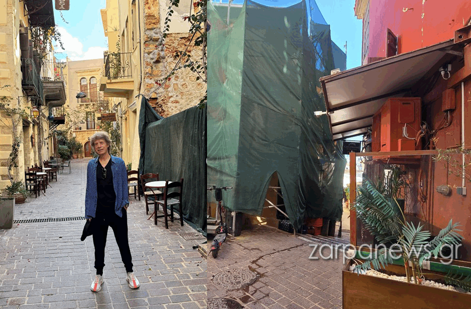 Βλέποντας τις φωτογραφίες, μας ήρθε στο νου και μια πελώρια  σκαλωσιά με μια ολόιδια λινάτσα που κακοποιεί το τοπίο λίγα μέτρα πιο πάνω, δέκα βήματα από το ξενοδοχείο όπου έμεινε ο Μικ Τζάγκερ, σε σημείο από όπου περνούν αναπόφευκτα στη διάρκεια της διαμονής τους, τόσο οι VIP όσοι και οι “κοινοί” τουρίστες που καταλύουν στην οδό Θεοτοκοπούλου και τις παρόδους της, αναμφίβολα το πιο τουριστικό σημείο της πόλης των Χανίων. Ακόμα και οι ημερήσιοι επισκέπτες κρουαζιέρας αλλά και οι ντόπιοι επιλέγουν αυτά ακριβώς τα στενά για τις βόλτες τους που σε μεγάλο βαθμό συνοδεύονται από τα ανάλογα “stories” και τις αναρτήσεις στα κοινωνικά δίκτυα.