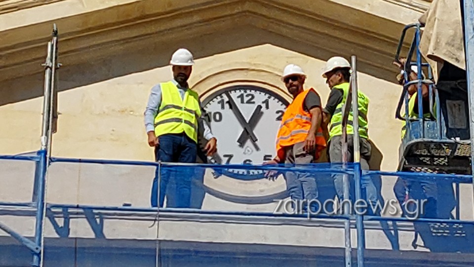 Ο Δήμαρχος Χανίων, Παναγιώτης Σημανδηράκης, ανέβηκε με καλάθι γερανοφόρου και τοποθέτησε ο ίδιος την ώρα στο νέο ρολόι που είναι πιστό αντίγραφο του αυθεντικού αλλά με νέο σύγχρονο μηχανισμό λειτουργίας.