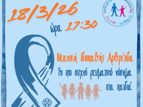 Ο Σύλλογος Ρευματοπαθών Κρήτης, στο πλαίσιο του προγραμματισμού ενημέρωσης κοινού για το 2026 και με αφορμή την 18η Μαρτίου – Παγκόσμια Ημέρα Νεανικών Ρευματικών Νοσημάτων, που στοχεύει στην ευαισθητοποίηση για τις ρευματικές παθήσεις που επηρεάζουν παιδιά και εφήβους, διοργανώνει την Τετάρτη 18 Μαρτίου 2026 και ώρα 17:30 ενημερωτική εκδήλωση με τίτλο «Νεανική Ιδιοπαθής Αρθρίτιδα: Το πιο συχνό ρευματικό νόσημα στα παιδιά» στα Χανιά, στη συνεδριακή αίθουσα της Συνεταιριστικής Τράπεζας Χανίων, Ελ. Βενιζέλου 28-32.