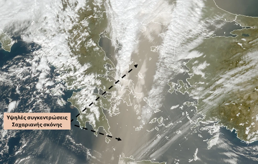 Υψηλές συγκεντρώσεις Σαχαριανής σκόνης καταγράφονται σε μεγάλο μέρος της χώρας το μεσημέρι της Κυριακής 15/02, όπως διακρίνεται και από τη δορυφορική εικόνα του Ευρωπαϊκού δορυφόρου MTG της EUMETSAT.