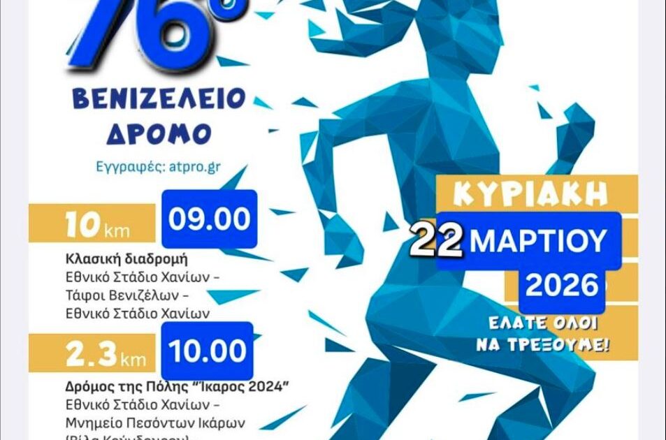 Η Περιφέρεια Κρήτης – Περιφερειακή Ενότητα Χανίων, ο Δήμος Χανίων, η Ε.Α.Σ. Σ.Ε.Γ.Α.Σ. ΚΡΗΤΗΣ, το Ε.Α.Κ. Χανίων και ο Αθλητικός και Ναυταθλητικός Όμιλος Χανίων «Ο ΚΥΔΩΝ», το Ίδρυμα Ερευνών & Μελετών «Ελ. Κ. Βενιζέλος» – ΕΑΚ Χανίων – Τμήμα Τροχαίας Χανίων – Τμήμα Εθελοντών Σαμαρειτών Ε.Ε.Σ. – Ομάδα Εθελοντών Πολιτικής Προστασίας Δήμου Χανίων συνδιοργανώνουν τον 76ο Βενιζέλειο Αγώνα Δρόμου και τον Δρόμο της Πόλης «ΙΚΑΡΟΣ 2026», οι οποίοι είναι αφιερωμένοι στη μνήμη του Εθνάρχη μας, Ελευθέριου Κ. Βενιζέλου.