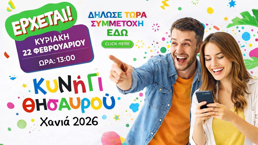 Το Κυνήγι Θησαυρού 2026 που συνδιοργανώνουν το Zarpa Radio 89,6, o Δήμος Χανίων, η Περιφέρεια Κρήτης και το ΕΒΕΧ, είναι ένα φοβερά διασκεδαστικό, ομαδικό παιχνίδι το οποίο θα πραγματοποιηθεί την τελευταία Κυριακή της Αποκριάς, 22 Φεβρουαρίου και θα έχει ως έπαθλο 1.000 € μετρητά και δώρα συνολικής αξίας 15.000 €.