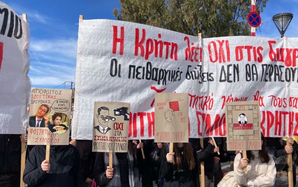 Η κυβέρνηση της ΝΔ δεν έχει την αποδοχή του λαού και της νεολαίας. Για αυτό επιχειρεί να καταστείλει το φοιτητικό κίνημα μέσα από το νόμο που ψήφισε το καλοκαίρι με πειθαρχικές και ποινικές διώξεις, σχέδια ασφαλείας και το φοιτητικό ιδιώνυμο. Τα μέτρα αυτά αποτελούν αυταρχική τομή για το πανεπιστήμιο και επιχειρούν την ποινικοποίηση κάθε πτυχής της κοινωνικής και πολιτικής ζωής των φοιτητών. Οι πειθαρχικές διώξεις προβλέπουν μια σειρά από αυταρχικές ποινές φωτογραφίζοντας πρακτικές των φοιτητών όπως ο συνδικαλισμός και οι κινητοποιήσεις με τις οποίες οι φοιτητές μπορούν να υπερασπίζονται την προοπτική τους. Το προηγούμενο διάστημα είδαμε εγκάθετους της κυβέρνησης στις διοικήσεις των σχολών να προσπαθούν να υλοποιήσουν τα πειθαρχικά με χαρακτηριστικό παράδειγμα τον κοσμήτορα Καρυστινό στο πολυτεχνείο Κρήτης, ο οποίος επιχειρεί να περάσει πειθαρχικό 7 φοιτητές για ανακοίνωση που έκαναν για τα Τέμπη. Την περίοδο που οι δίκαιες κινητοποίησεις των αγροτών όλο και κλιμακώνονται, η κυβέρνηση είναι με την πλάτη στον τοίχο.