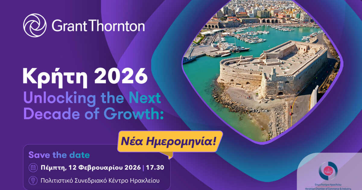 Με νέα ημερομηνία στις 12 Φεβρουαρίου 2026 και ώρα 17:30 θα πραγματοποιηθεί η εκδήλωση της Grant Thornton με τίτλο “Unlocking the Next Decade of Growth: Embracing Technology, Investment, and Global Expansion”, υπό την αιγίδα του Εμπορικού και Βιομηχανικού Επιμελητηρίου Ηρακλείου, στο Πολιτιστικό Συνεδριακό Κέντρο Ηρακλείου.