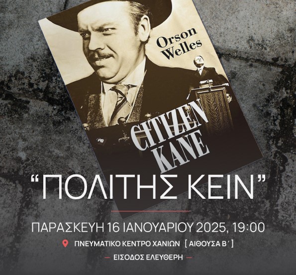 Ο Σύλλογος Εθελοντικής Προσφοράς Καθηγητών και Φίλων «Πολυδράση», σε συνδιοργάνωση με το Φεστιβάλ Κινηματογράφου Χανίων, την Περιφέρεια Κρήτης – Περιφερειακή Ενότητα Χανίων και το Πνευματικό Κέντρο Χανίων, διοργανώνει την προβολή της ταινίας «Πολίτης Κέιν», σε σκηνοθεσία Όρσον Γουέλς, την Παρασκευή 16 Ιανουαρίου 2026, ώρα 19.00, στην αίθουσα του Δ.Σ. του Πνευματικού Κέντρου Χανίων, με ελεύθερη είσοδο.