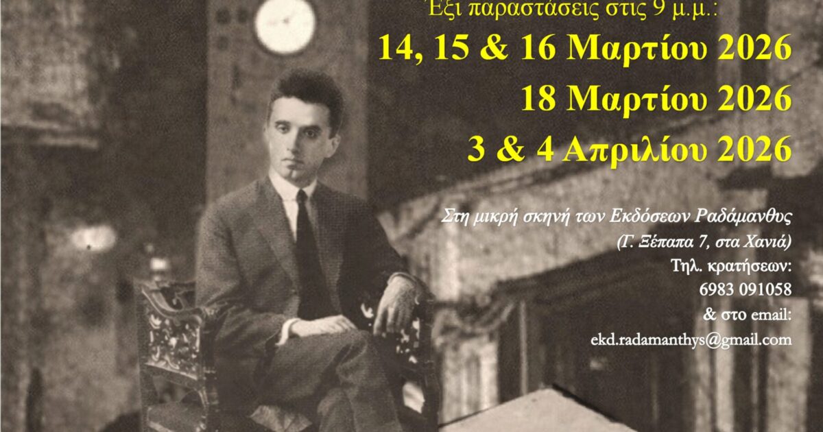 Μια παράσταση εσωτερικής έντασης, ποιητικής ατμόσφαιρας και ιστορικής μνήμης, που συνομιλεί με το σήμερα, αναζητώντας τη λεπτή γραμμή ανάμεσα στη φθορά και την αθανασία. Έξι παραστάσεις στις 9 μ.μ.: 14, 15 & 16 Μαρτίου 2026, 18 Μαρτίου 2026, 3 & 4 Απριλίου 2026. Στη μικρή σκηνή των Εκδόσεων Ραδάμανθυς (Γ. Ξέπαπα 7, στα Χανιά)