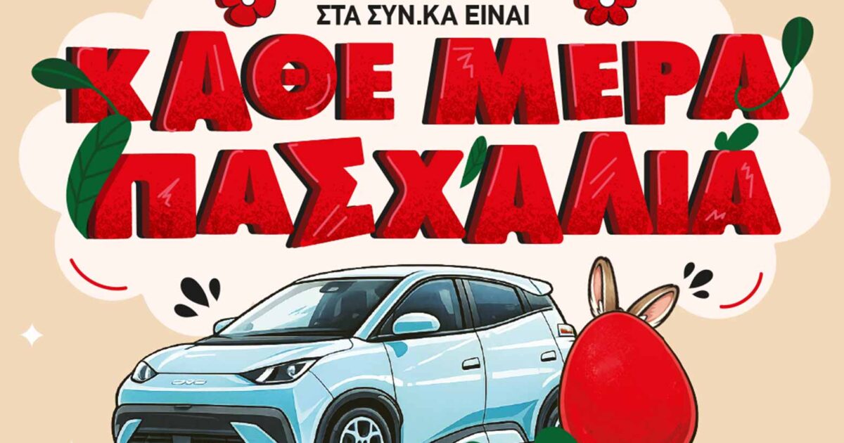 Η ελληνική αλυσίδα σούπερ μάρκετ SYN.KA διοργανώνει και φέτος μεγάλο πασχαλινό διαγωνισμό με τίτλο «Κάθε Μέρα Πασχαλιά», δίνοντας την ευκαιρία στους πελάτες της να επωφεληθούν από εκπτώσεις, αλλά και να διεκδικήσουν ένα ηλεκτρικό αυτοκίνητο BYD Dolphin Surf.