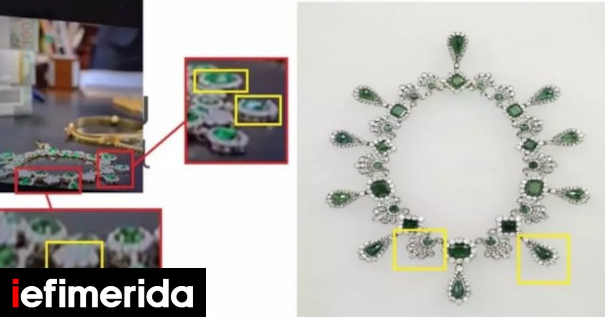 Σύγκριση των κοσμημάτων που εμφανίζονται στο αμφιλεγόμενο βίντεο (αριστερά) με το αυθεντικό κολιέ της αυτοκράτειρας Μαρίας-Λουίζ που κλάπηκε από το Λούβρο / France24