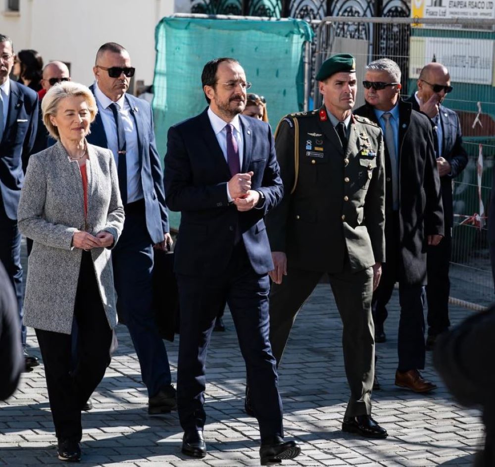 Ο κ. Χριστοδουλίδης, σε μια κίνηση συμβολισμού, «ξενάγησε» την κ. Φον Ντερ Λάιεν στην Πράσινη Γραμμή της Λευκωσίας, την μοναδική πλέον διαιρεμένη πρωτεύουσα της Ευρώπης, μετά την επανένωση του Βερολίνου.