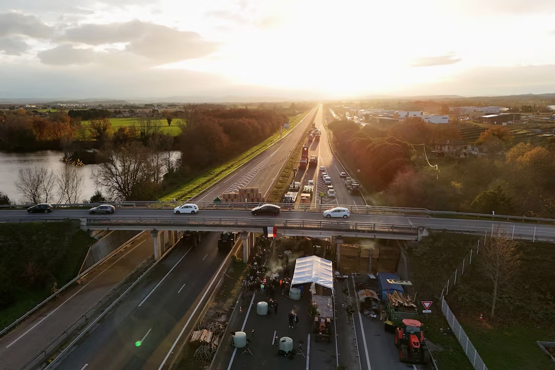Ιδιαίτερα στην Καρμπόν, κοντά στην Τουλούζη, όπου οι αγρότες κατασκήνωσαν για τέταρτη νύκτα, τρακτέρ και δέματα με άχυρο κλείνουν τον αυτοκινητόδρομο.
