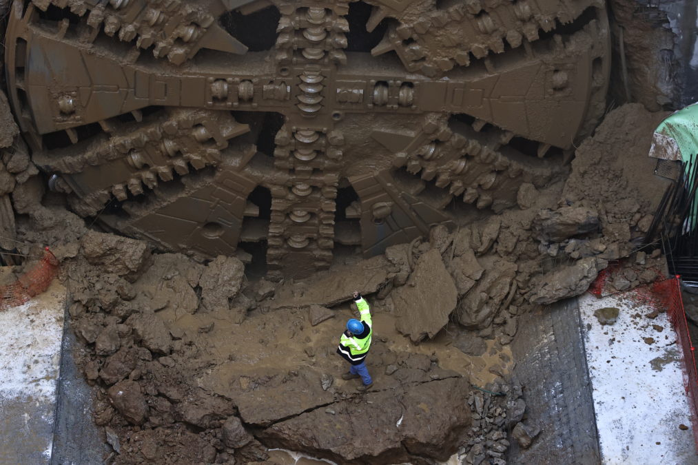 Το «ξετρύπημα» αυτό του πρώτου από τους δύο μετροπόντικες που δουλεύουν για το μεγαλύτερο δημόσιο έργο της χώρας, είναι το ορόσημο της θραύσης του τοιχίου του φρέατος, στη γλώσσα του κατασκευαστικού κλάδου ονομάζεται breakthrough (μπρέικθρου).