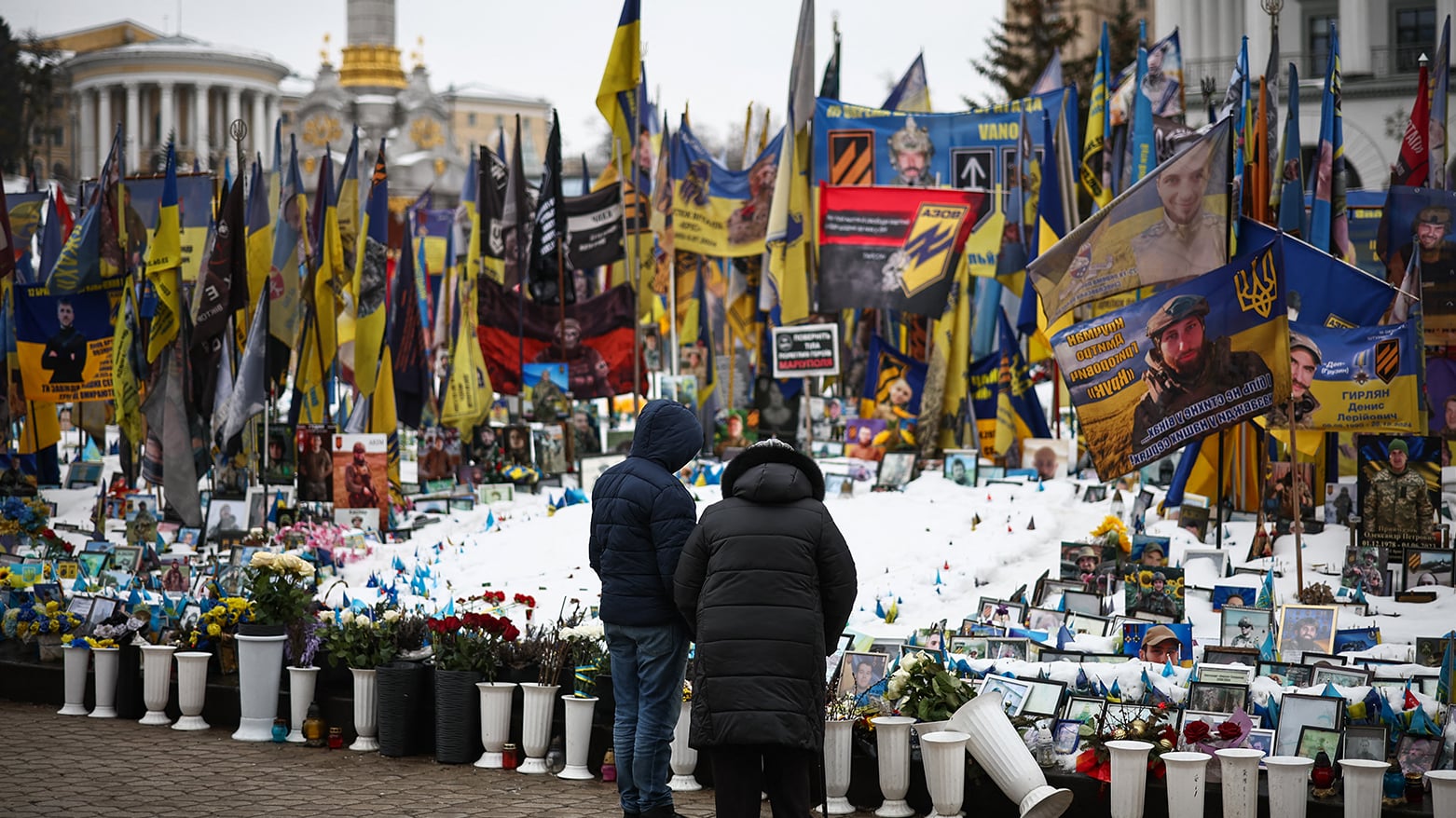 Άνθρωποι στέκονται μπροστά σε αυτοσχέδιο μνημείο για τους πεσόντες στρατιώτες στην Πλατεία Ανεξαρτησίας (Μαϊντάν) στο Κίεβο, στις 23 Φεβρουαρίου 2026.