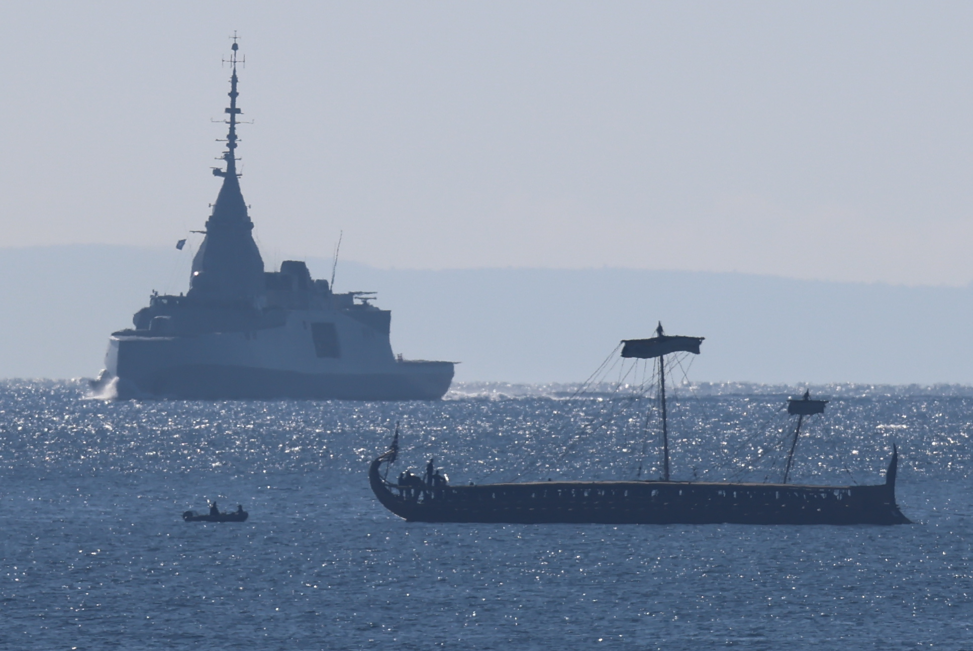 Η φρεγάτα πέρασε ανάμεσα από τα δύο ιστορικά πλοία του Πολεμικού Ναυτικού, βάζοντας τα πυροβόλα της υπό κλίση για να αποδώσει τιμές. Χαρακτηριστική εικόνα ήταν, όταν η τριήρης χαιρέτησε τη φρεγάτα, με τους δόκιμους του Πολεμικού Ναυτικού να σηκώνουν τα κουπιά από τη θάλασσα. Παράλληλα, το πλήρωμά του «Αβέρωφ» τέθηκε σε ακινησία αποδίδοντας τιμές.