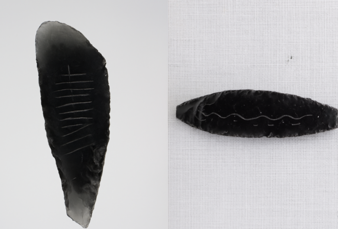 Δύο διακοσμημένα εργαλεία από οψιδιανό από τις νεολιθικές στρώσεις του Τζανχασάν. Το αντικείμενο στα αριστερά φέρει παράλληλες εγχάρακτες γραμμές, ενώ το δείγμα στα δεξιά διαθέτει κυματιστό μοτίβο χαρακτηριστικό της συμβολικής παράδοσης του οικισμού. Φωτογραφία Προσφορά της Ανασκαφικής Ομάδας Canhasan.