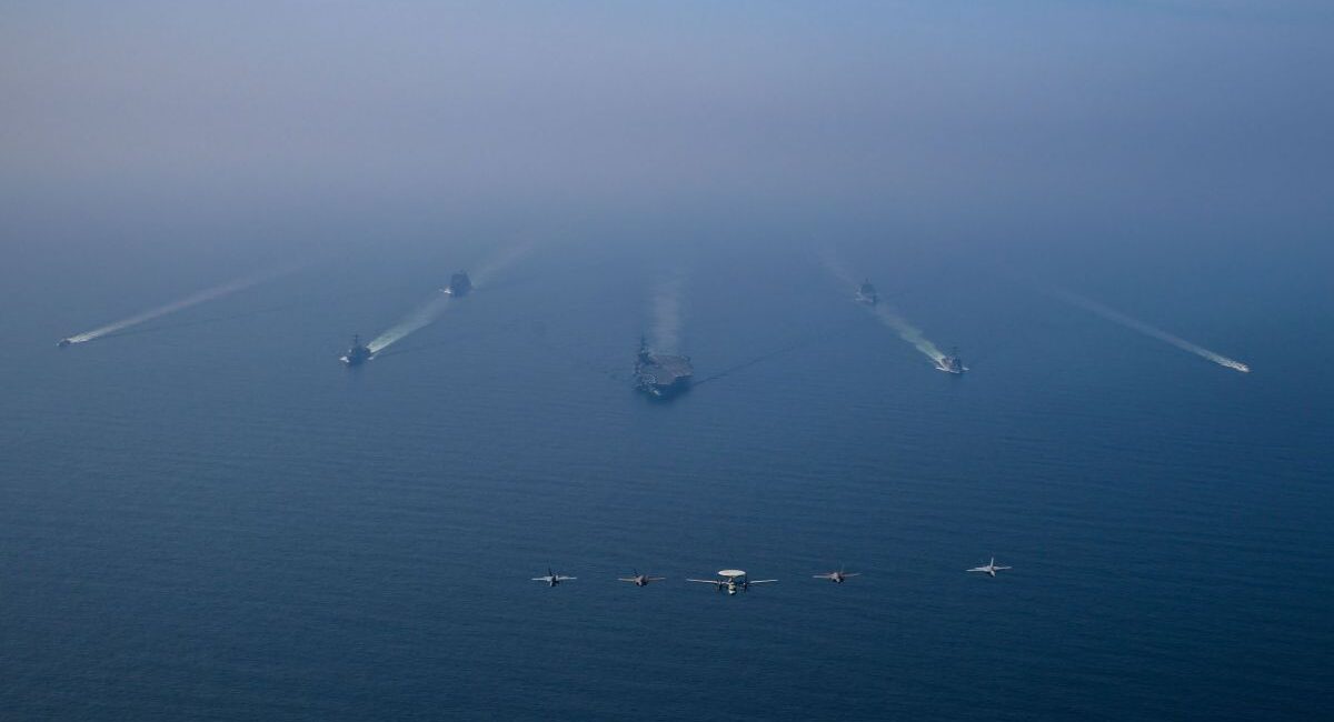 The Abraham Lincoln Carrier Strike Group, accompanied by two military supply ships, and two U.S. Coast Guard cutters, sailed together in the Arabian Sea today as aircraft from Carrier Air Wing 9 flew overhead. Peace through Strength! ⚓️ pic.twitter.com/xkiCk8qymB