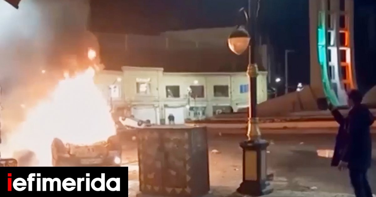 Στιγμιότυπο από βίντεο που δόθηκε στη δημοσιότητα την Παρασκευή 9 Ιανουαρίου 2026 από την ιρανική κρατική τηλεόραση με φλεγόμενα οχήματα κατά τη διάρκεια νυχτερινών μαζικών διαδηλώσεων στη Ζαντζάν / Φωτογραφία: ΑΡ