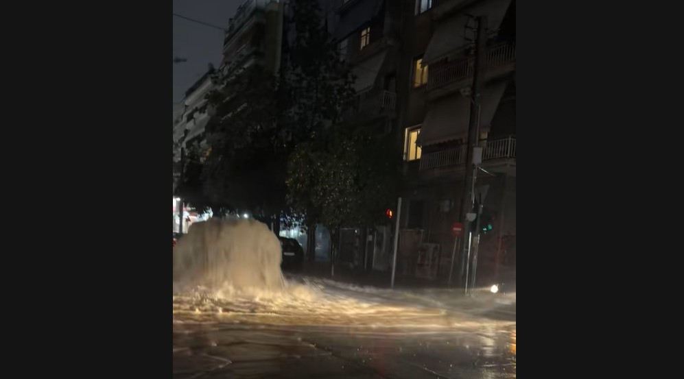 Σε βίντεο που κυκλοφόρησε στα social media φαίνεται πίδακας νερού να εκτοξεύεται από το οδόστρωμα, στη διασταύρωση των οδών Σκρα και Ανδρομάχης, πιθανότατα λόγω υπερπίεσης ή βλάβης στο δίκτυο ύδρευσης, μετά την καταιγίδα.
