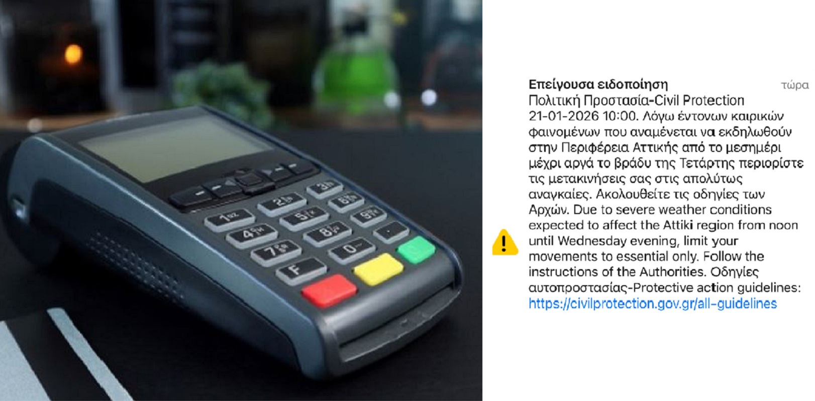 Ειδοποιήσεις του 112 εμφανίστηκαν σε τερματικά POS, με κύκλους του υπουργείου Κλιματικής Κρίσης και Πολιτικής Προστασίας να ξεκαθαρίζουν ότι το φαινόμενο αυτό συνδέεται με τα τεχνικά χαρακτηριστικά ορισμένων σύγχρονων τερματικών και όχι με δυσλειτουργία του συστήματος 112.