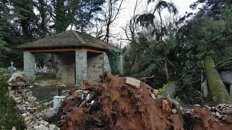 Στο Δίλοφο Ζαγορίου, η σφοδρή κακοκαιρία Adel των τελευταίων 24 ωρών, με έντονη βροχή και ισχυρούς ανέμους, προκάλεσε εκτεταμένες καταστροφές στο κοιμητήριο του χωριού.