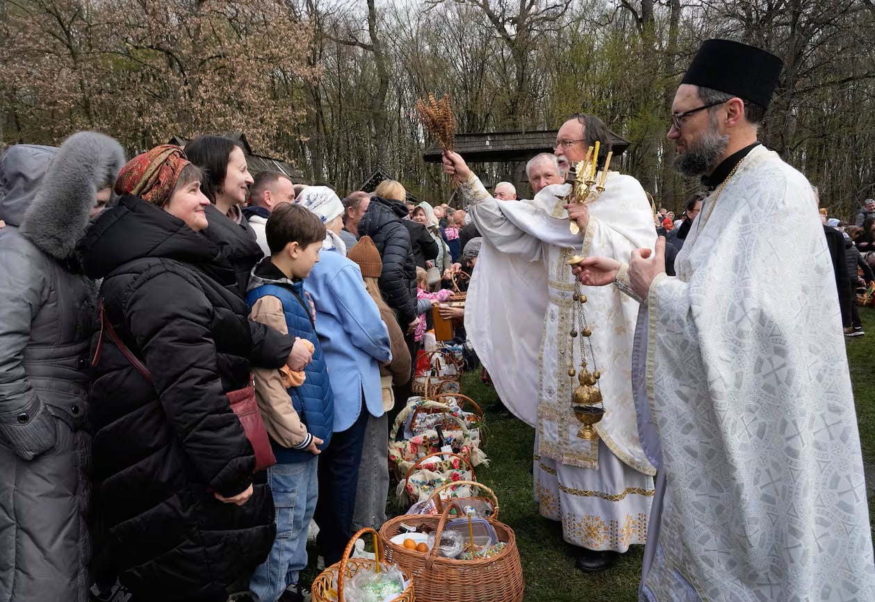 Ιερείς ευλογούν πιστούς και τα πασχαλινά καλάθια τους για να γιορτάσουν το Ορθόδοξο Πάσχα, στο Πυρόχιβ, κοντά στο Κίεβο, Ουκρανία, Κυριακή, 12 Απριλίου 2026. (Efrem Lukatsky | AP Photo/Efrem Lukatsky)