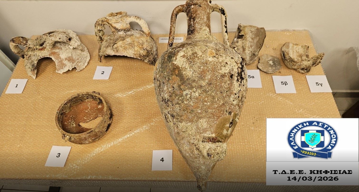 Από αστυνομικούς του Τμήματος Δίωξης και Εξιχνίασης Εγκλημάτων Κηφισιάς/Δ.Δ.Ε.Ε.Α./Γ.Α.Δ.Α. εντοπίστηκαν εντός οικίας 50χρονου ημεδαπού, πρωινές ώρες της 14-3-2026 στην περιοχή της Κηφισιάς, -10- τμήματα ενάλιων αμφορέων.