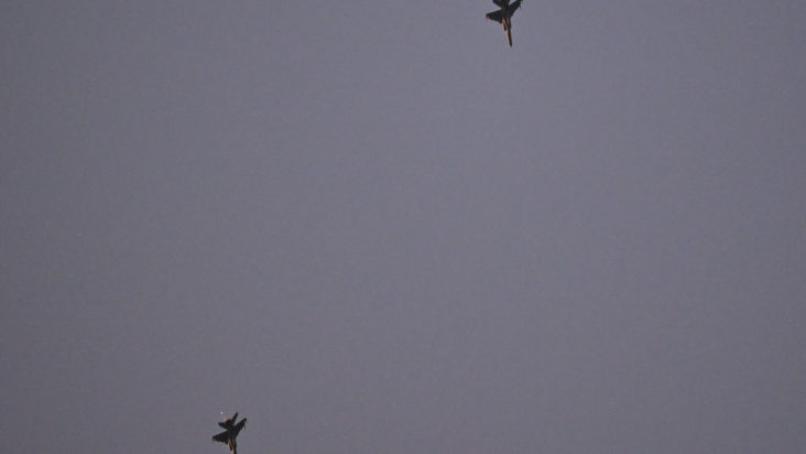 A pair of Chinese JH-7A fighter-bomber aircraft fly over the Taiwan Strait as seen from Pingtan island, the closest point to Taiwan, in eastern Chinas Fujian province on December 29, 2025. China launched live-fire drills around Taiwan on December 29 that it said would simulate a blockade of the self-ruled island’s key ports, prompting Taipei to condemn Beijing’s “military intimidation”. (Photo by ADEK BERRY / AFP)